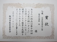 三行詩コンクールの表彰がありました。三行詩コンクールに4年生2名が入選、4年生と6年生の2名が佳作に選ばれました。「いやなことがあった日は、ゆうはんの時に話すとね おなかいっぱい 心はスッキリ いつのまにかにっこにこ」「ゲームはね 会話をへらす 悪いやつ」「ゆいの日は おやのためにも がんばるぞ」「「おはよう」で家族みんなが 元気100倍!」と、それぞれ工夫された素晴らしい詩です。この受賞を励みに、また頑張っていってほしいと思います。