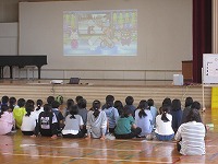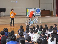 実演を交えての自転車の乗り方や、自転車で通行するときの注意などを図で示しながら教えていただきました。その後はビデオにより交通安全について守るべき事を確認しました。子どもたちは真剣に見入っている姿があり、気をつけようという意識を高めてくれたのではないかと思います。これからも交通には十分注意して安全に過ごしてほしいと思います。